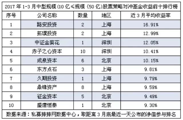 4月21日,私募排排网本颁布了一份榜单,参考私募管理规模情况,将私募机构划分为小型私募(0亿<规模<10亿)、中型私募(10亿≤规模<50亿)、大型私募(50亿≤规模<100亿)以及巨型私募(规模≧100亿)等4大类型,并选取不同规模私募机构旗下股票策略产品2017年1-3月平均收益率十强。