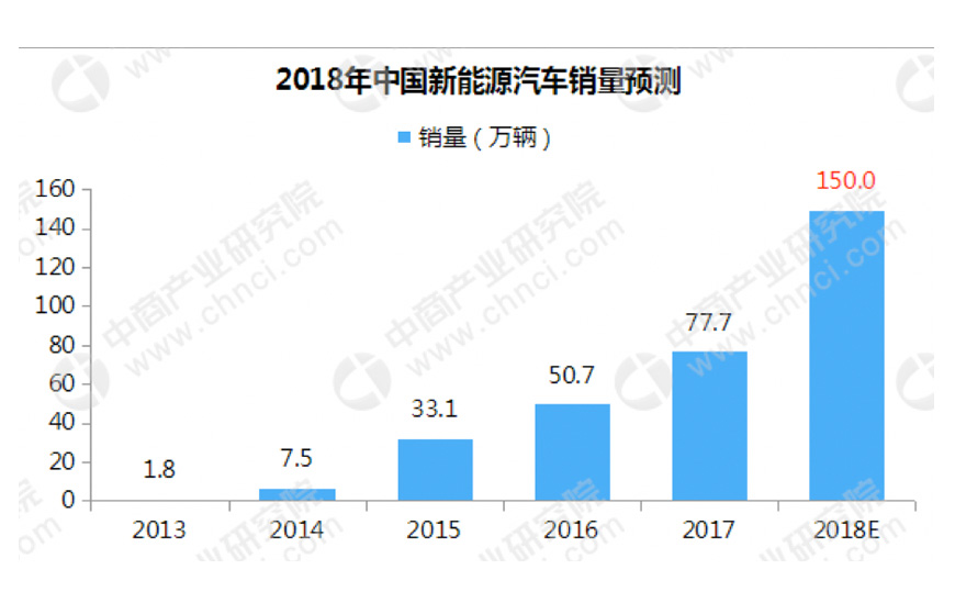 今年以来,我国新能源汽车推广情况良好,电动汽车产销量保持快速增长。数据统计显示,2017年中国新能源汽车销量达77.7万辆。到2018年,预计中国新能源汽车销量将达150万辆。
