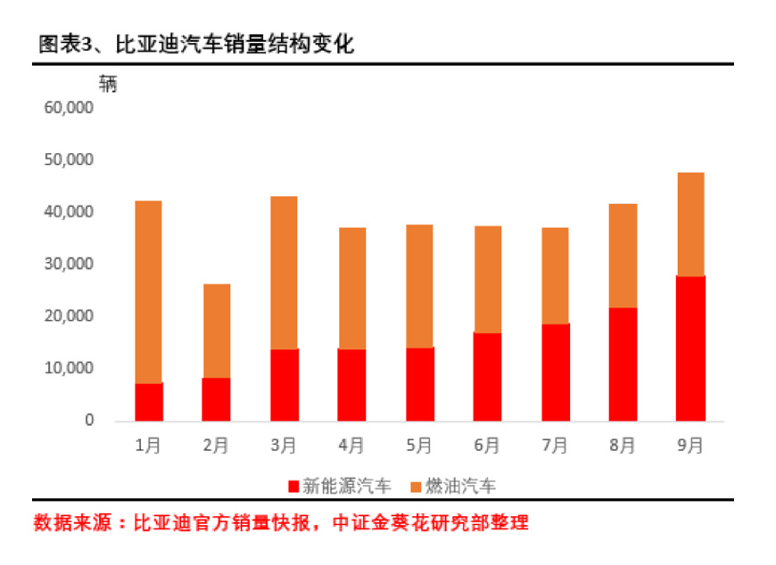 作为新能源汽车行业龙头比亚迪,通过销售快报的数据来看,其今年以来加大新能源汽车的销售力度,加快布局新能源汽车市场。从今年7月开始,其新能源汽车单月销量已经超过燃油车销量,并呈快速增长趋势,可见比亚迪对于布局新能源汽车市场的战略意图已经很明显。