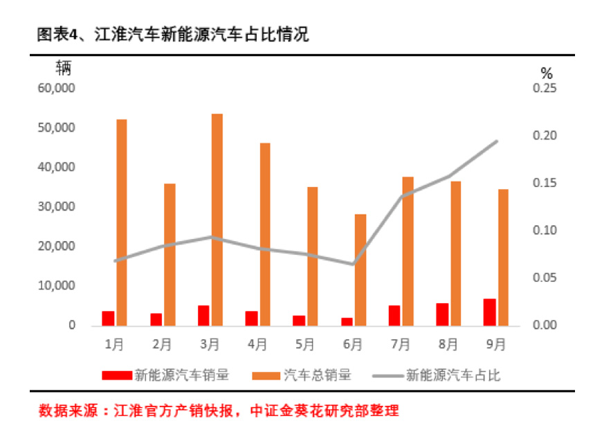 类似的情况也出现在江淮汽车内部,尽管江淮的新能源汽车与燃油汽车销量上仍存在较大差距,但新能源汽车占汽车总销量比重已经在快速增长。从6月开始,江淮的新能源汽车占比突然爆发式增长,到9月占比已经近20%。