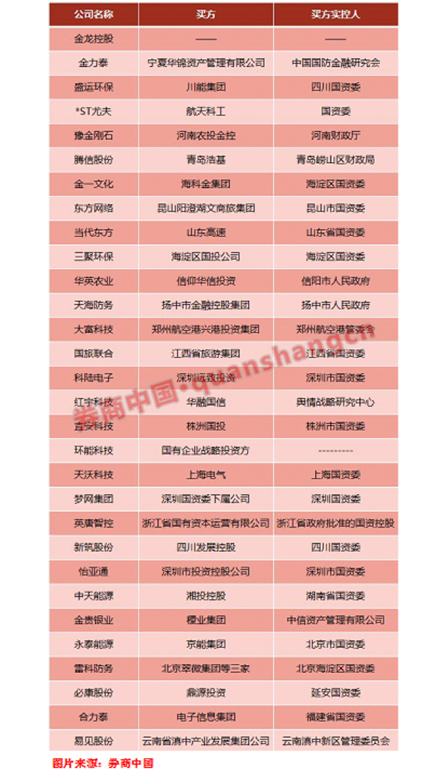 和深圳一样,山东、浙江、福建、四川、河北、北京等地不同层级国资也在加速入场,比如山东的合力泰,近期就被福建省电子信息(集团)有限责任公司收入囊中;易见股份大股东九天股份全部持股被司法冻结后搬来云南国资救兵,使得易见股份被云南国资接手,此外还有更多企业被各地国资接管:盛运环保被四川国资控股、金一文化收归海淀区国资、山东国资控股当代东方等等。
