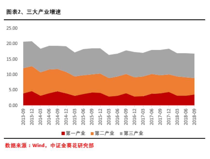 从三大产业结构上看,三季度第一产业同比增速3.6%,较上季度3.2%有所提升,考虑主要是今年三季度极端天气造成农产品,尤其是鲜菜鲜果价格上涨导致的物价上涨,从而使第一产业GDP有所提高;第二产业同比增速5.3%,较二季度6.0%下降0.7个百分点,结合三季度社融增速下降,反应投资需求进一步降低;第三产业同比增速7.9%,较二季度增速7.8%上升0.1个百分点,保持平稳增长。
