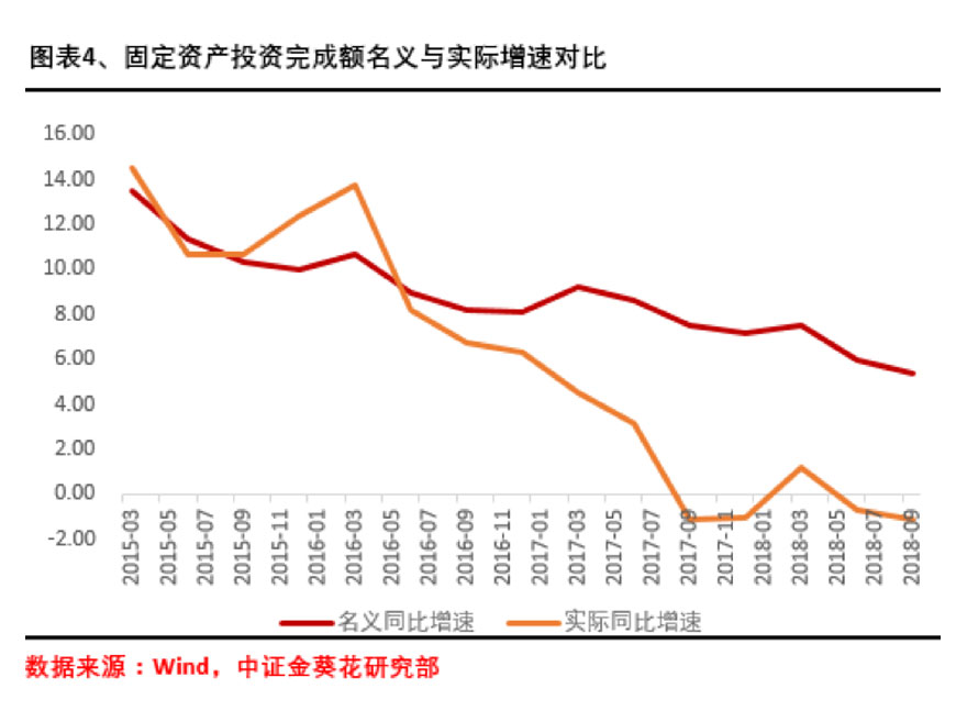 投资方面,前三季度固定资产投资完成额为48.34万亿,同比增速5.4%,低于上半年累计同比6.0%,在剔除价格因素影响后,实际同比增速则降到-1.13%,是03年有记录以来的最低点,可以看出固定资产投资仍在底部徘徊,投资需求总体较弱。