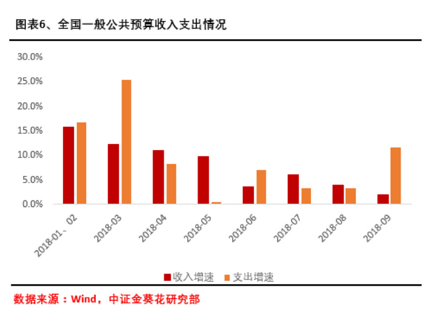 由此可见,国家及地方政府对于减税的力度之大,今年以来全国一般公共预算收入持续下降,公共预算支出也在9月有了大幅度提高。尤其9月增值税累计收入增速12%,较1-8月增速降低1.6个百分点,增值税收入5月以来持续降低。减税政策效果初见成效。