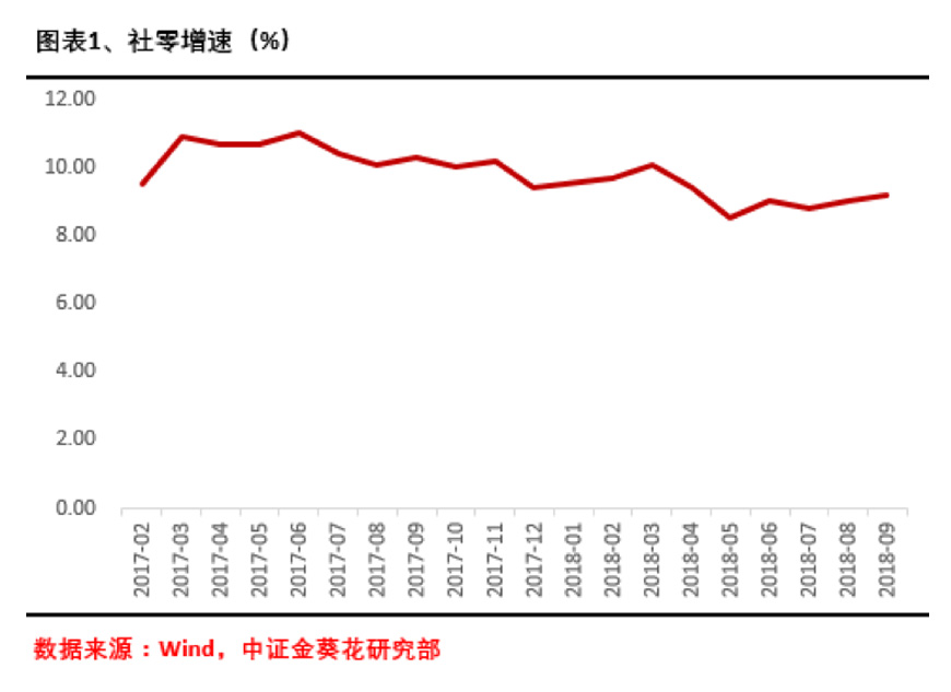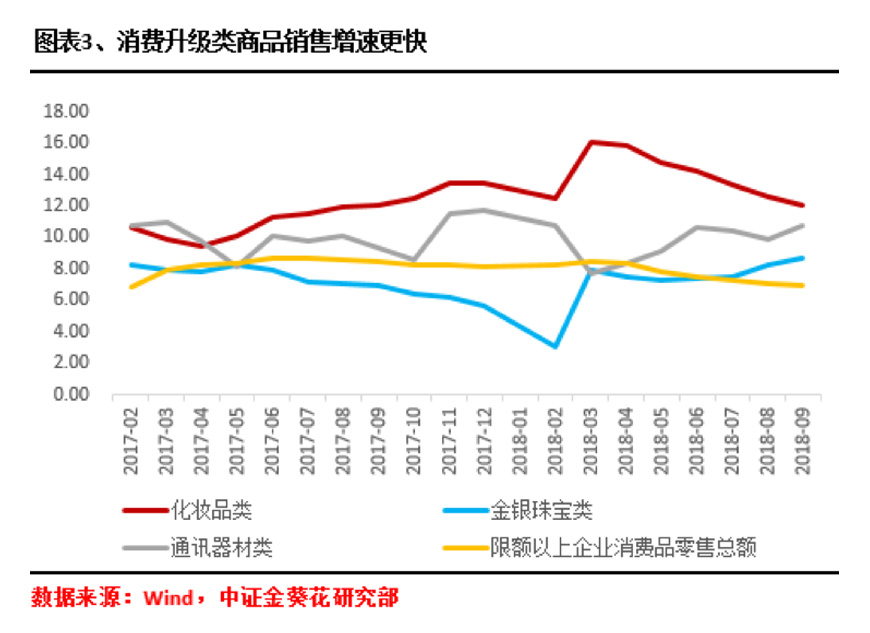 对于不同品类商品的需求上,消费升级类销售相对加快。我们看到,与消费升级有关的化妆品类、金银珠宝类、通讯器材类今年前三个季度零售额同比增速分别为12.0%、8.7%、10.7%,今年以来表现超过限额企业消费品零售总额的平均水平,且前三季度分别比平均水平高出5.1、1.8和3.8个百分点。
