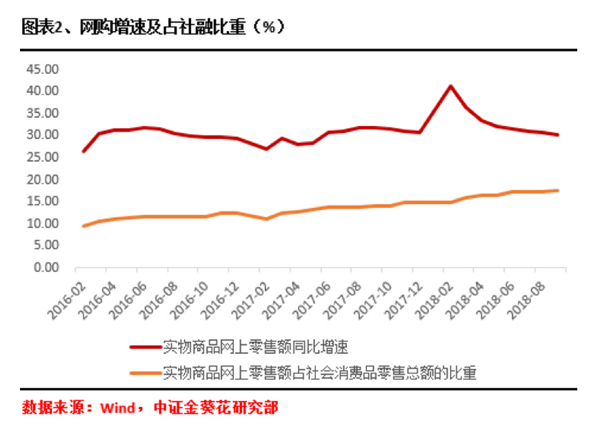 前三季度社零总额27.43亿元,其中实物网上商品零售额4.79亿元,占比17.5%。随着互联网的发展普及以及针对农村市场的电商平台(例如拼多多等)崛起,网购占整个社零的比重在持续提升。但是实物网上商品零售额同比增速自今年年初以来有一个比较明显的下降趋势,近期趋于平稳。