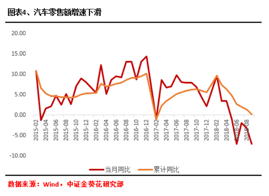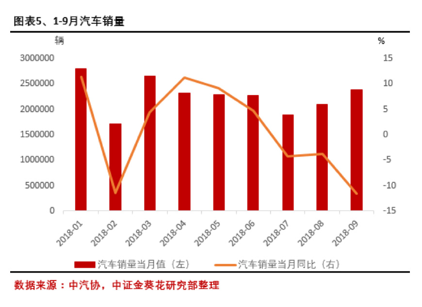 在汽车销量上可以得到同样的结果。通过中汽协口径数据,9月汽车销量同比增速为-11.63%,销量上下降更加明显,并且今年以来增速呈持续下滑态势。