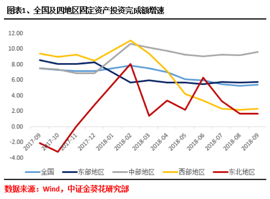 前三季度固定资产投资完成额48.34万亿元,同比增长5.4%,比1-8月增加0.1个百分点,总体表现出企稳态势。分地区看,东部地区前三季度固定资产投资完成额同比增加5.8%,比1-8月增加0.1个百分点;中部地区同比增长9.6%,比1-8月增加0.4个百分点;西部地区同比增长2.3%,比1-8月增加0.1个百分点;东北地区同比增长1.7%,与1-8月持平。