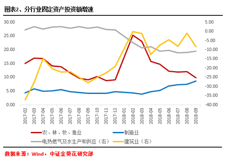 分行业来看,前三季度,农、林、牧、渔投资增速9.8%,增速仍然较高,但今年以来下降趋势明显;电热燃气水生产及供应投资增速-10.7%,今年以来持续负增长,并趋缓;建筑业增速仍为负,但有回暖趋势。