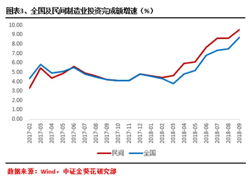 从行业角度来看,民间投资于全国投资保持基本一致趋势。制造业前三季度民间固定资产投资完成额同比增长9.5%,比1-8月增加0.9个百分点,继续维持增长趋势。从去年底到今年三季度,民间的制造业投资增速实现翻倍。