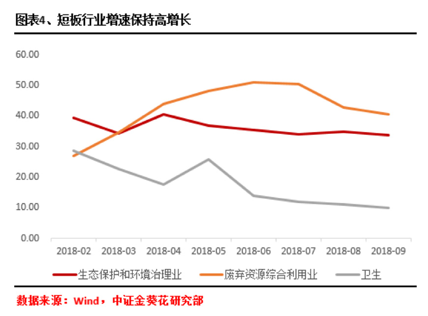 其中,前三季度生态保护和环境治理业投资完成额同比增长33.7%,废弃资源综合利用业投资完成额同比增长40.4%,卫生行业投资完成额同比增长10.0%。短板行业投资情况表现出高增长并趋于缓和的态势。