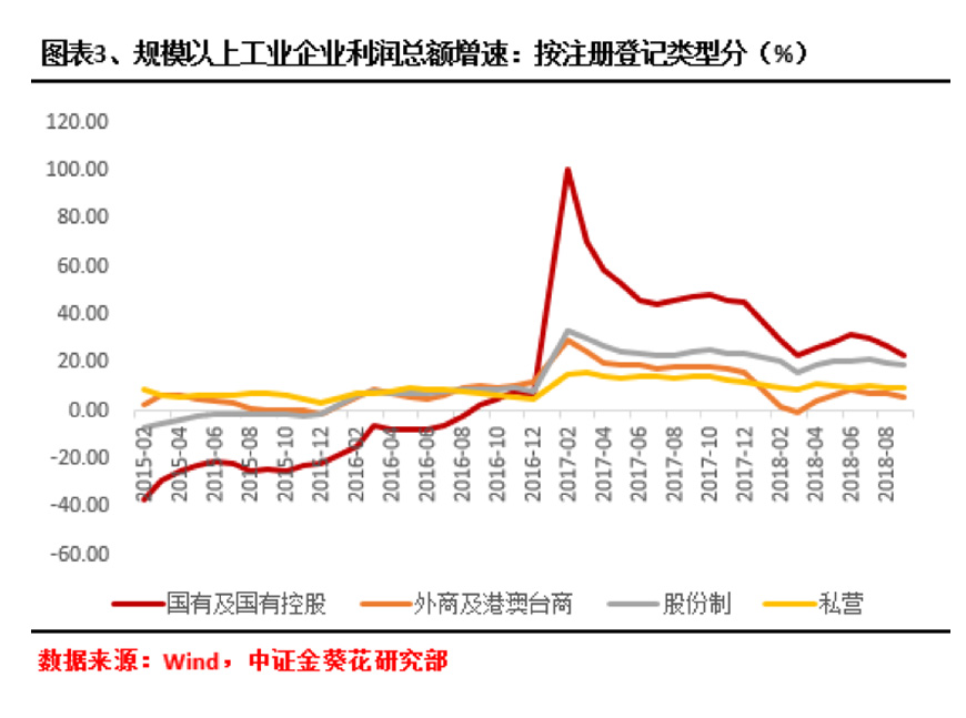 前三季度国有企业利润总额同比增长23.3%,私营企业同比增长9.3%,尽管国有企业与私营企业之间仍存在较大差距,但是从动态角度看,国有企业利润增速从2017年前三季度的47.6%到今年同期的23.3%,下降了24.3%,,而同样时间内私营企业只降低了4.2%。而且国企、私企利润总额增速差距也由33.1%缩小至14%。