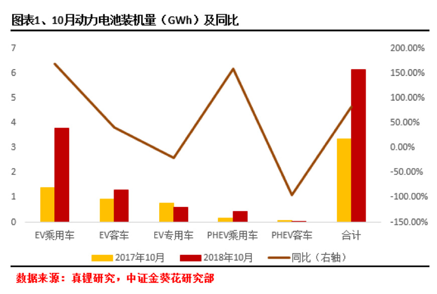 10月动力电池6.1GWh,同比大增82.9%,环比微增2%。其中的主力增长点是新能源乘用车,10月新能源乘用车动力电池装机量3.78GWh,同比增长高达168.14%,是总体增幅的一倍还多,装机量绝对值占总装机量61.97%,而与10月新能源乘用车占乘用车产量比重大体相当,也就意味着今后两者将保持一致增长趋势。