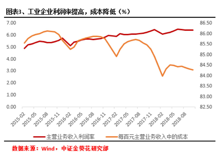 1-10月工业企业利润率提高,成本降低。1-10月份,规模以上工业企业主营业务收入利润率为6.44%,同比提高0.24个百分点。从工业三大门类看,采矿业利润率为13.12%,提高3.47个百分点;制造业利润率为6.14%,提高0.12个百分点;电力、热力、燃气及水生产和供应业利润率为6.18%,下降0.23个百分点。