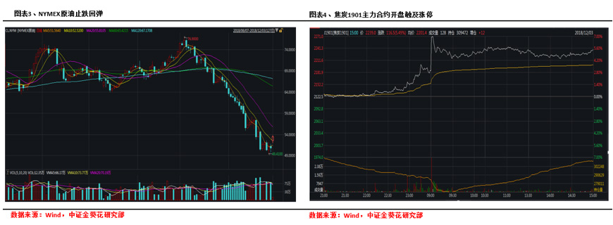 商品方面,国际原油价格开始止跌并出现报复式反弹,截止下午三点,NYMEX原油价格上涨4.91%,而其他大宗商品也出现大涨。焦炭1901主力合约开盘封涨停,随后开板仍高位运行,截止收盘,上涨5.49%;沪锌1902主力合约开盘也触及涨停板,随后高位平稳运行,截止收盘,上涨3.71%。