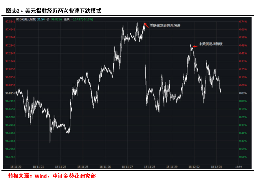 再看美元指数,先是在11月28日从最高点97.5341一路下跌到最低96.6227,源于美联储主席鲍威尔关于美元加息的鸽派演讲;再到G20峰会期间,中美双方达成重要共识,不再加征新的关税,美元指数再次从最高97.3093下跌到96.7158。