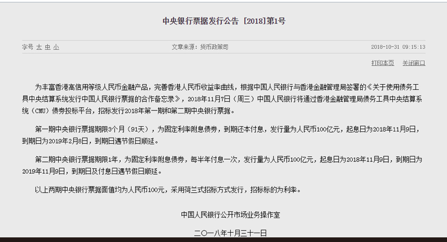10月31日,央行公布将在11月7日,于香港发行首批央票,第一期3个月,100亿元,第二期1年,100亿元。这是央行三年来第一次出海,也是历史上第二次发行离岸央票。作为调节市场流动性的央票,此次在香港发行,表明央行在离岸市场调控人民币流动性,增加人民币做空成本,从而提高人民币稳定性,调节离岸人民币汇率。作为市场反应,当天离岸人民币收复6.9700关口,但随后走高,而到了次日,也就是11月1日,作为反应国际市场对人民币预期的离岸人民币强势上涨0.82%。