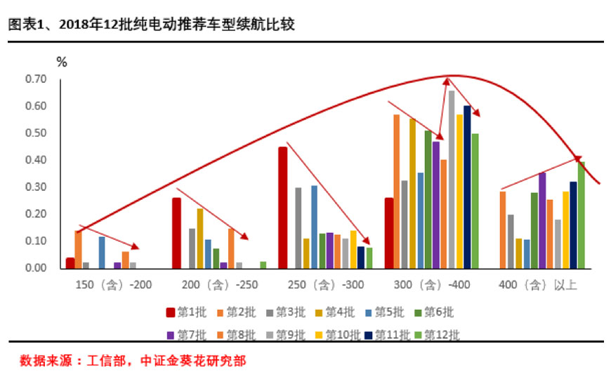 总体来看,纯电动乘用车2018年续航趋势清晰,目前300-400公里仍占主流,但随着车企在技术上的改进以及新材料应用,车辆轻量化升级,电池续航不断提高,400公里以上续航将更加普遍。