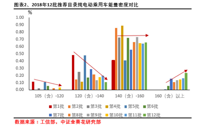从补贴角度来看,电池能量密度在140Wh/kg及以上的新能源乘用车将享受1.1倍补贴奖励,而160Wh/kg以上则享受1.2倍补贴奖励,以最近几批目录来看,140Wh/kg以上车型占比已经在80%-90%之间,也就是说,绝大多数推荐车型能够享受1.1或1.2倍奖励性补贴金额,详细内容后面我们再进一步分析。