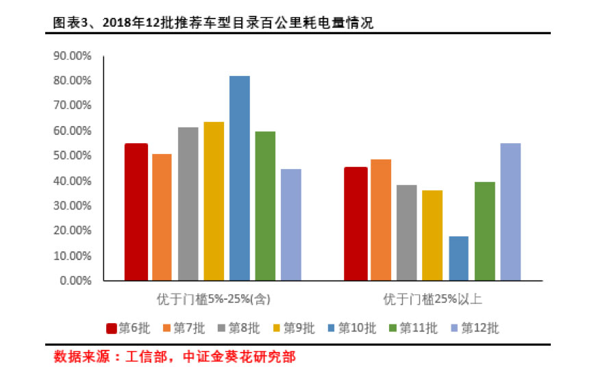从图表中我们也能看到,优于25%以上的新能源乘用车型占比呈现先下降后上升的趋势,分析主要原因是在补贴新政实施后,新能源车企需要有一定的过渡时间来推出能耗更低的车型,因此从第10批目录开始,我们看到这一比例开始快速上升,在12月份的数据中,55.26%的车型能耗标准优于门槛25%以上,意味着在政策因素驱动下,能耗优于门槛25%以上将成为厂商追逐的目标。