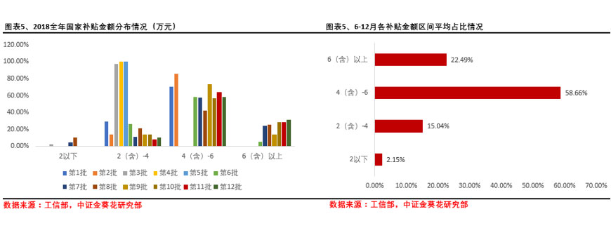 从补贴金额上看,目前大多车型补贴金额在4万元以上。并且一个比较有趣的现象是,尽管补贴新政表现出补贴退坡的趋势,但从下图中可以看到,由于补贴存在奖励系数,并且高续航补贴不但没有降低反而提高,导致在6月之后,4万元-6万元,甚至6万元以上的补贴占比情况在增加,而之前低补贴金额基本不再出现。