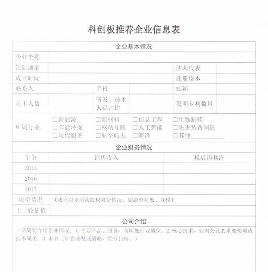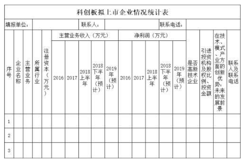 此前有记者得到一份文件显示,上海市经信委综合规划处于11月20日发布《关于征集推荐上交所科创板企业名单的通知》,要求有关部门和单位梳理推荐拟挂牌科创板的优质企业。从内容来看,表格要求填写企业主营业务、收入、净利润、已授权发明专利数、行业排名等。