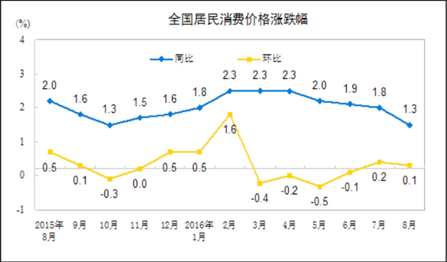 列表简介 :国家统计局9月9日公布数据显示,2016年8月份,全国居民消费价格指数(CPI)环比上涨0.1%,同比上涨1.3%;工业生产者出厂价格指数(PPI)环比上涨0.2%,同比下降0.8%,降幅进一步收窄。综合来看,8月份CPI同比上涨1.3%,大幅低于市场预期,主要受猪肉价格大幅回落影响。PPI连续8个月出现上行趋势,这说明终端需求正在显示积极信号。虽然通胀压力减弱为央行货币政策腾出了空间,但是在外围市场约束与整个经济结构调整大背景下,积极财政政策将是稳定经济增长的主要发力点。