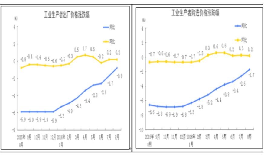 分析:8月份,工业生产者出厂价格同比下降0.8%,降幅比上月收窄0.9个百分点。今年以来工业生产者出厂价格同比降幅逐月收窄,一方面7、8月份受去年基数较低影响收窄幅度较大,另一方面煤炭等价格回升助推PPI降幅进一步收窄。从重要大类行业看:黑色金属冶炼和压延加工业价格同比继7月份由降转升以后,8月份涨幅明显扩大至6.5%;此外,有色金属冶炼和压延加工业价格同比也由降转升,上涨0.8%。