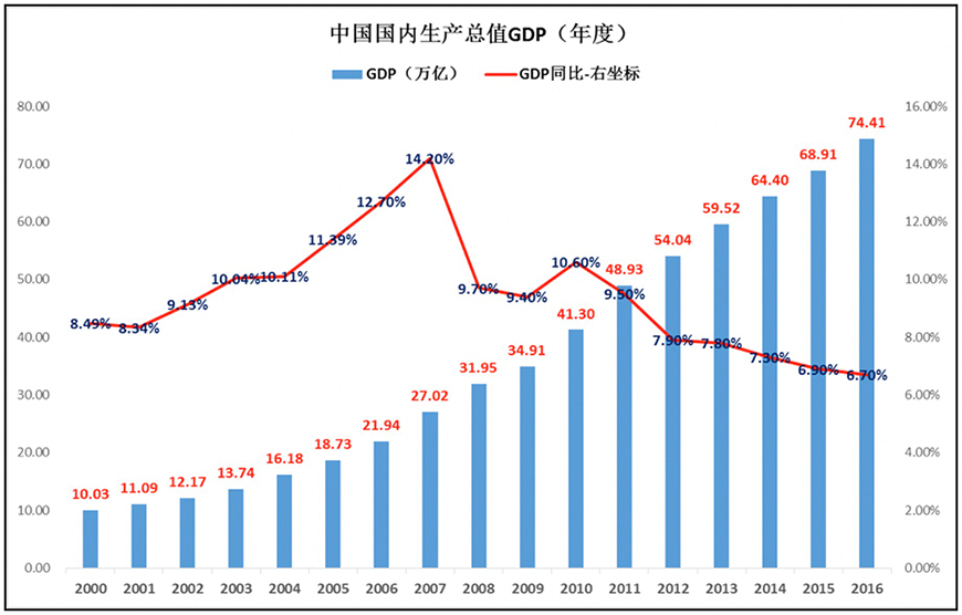2016年GDP同比增长6.7%,不仅实现了“十三五规划”的良好开局,而且纵向比较来看,2016年国内生产总值约为2000年的4.22倍。在“三步走”战略中,也就是说,我们已经提前4年实现了十六大提出的国内生产总值到2020年比2000年翻两番的目标。