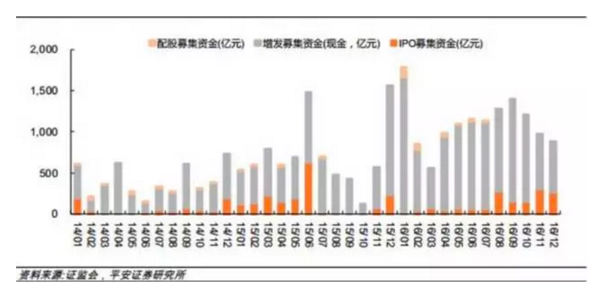 据证监会统计,2016年再融资规模1.15万亿,是历史最高的规模,较2015年上涨71.62%;而同年IPO规模仅为1496.09亿元。