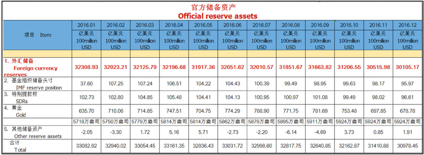 2016年官方储备资产变动