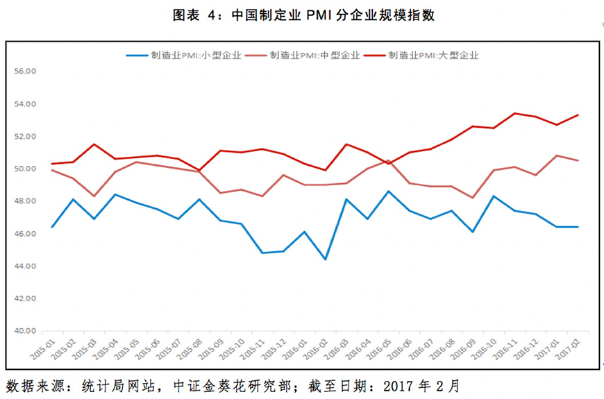 分企业规模看:大型企业PMI为53.3%,比上月上升0.6个百分点,持续高于临界点;中型企业PMI为50.5%,低于上月0.3个百分点,连续两个月位于临界点以上;小型企业PMI为46.4%,与上月持平,继续位于收缩区间。