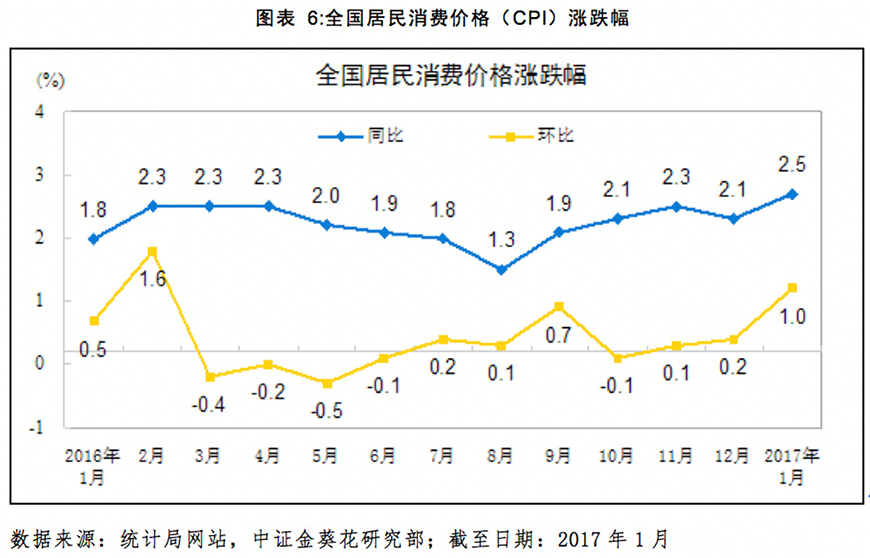 统计局公布数据显示,2017年1月份,CPI同比上涨2.5%。其中,食品价格上涨2.7%,非食品价格上涨2.5%;消费品价格上涨2.2%,服务价格上涨3.2%。