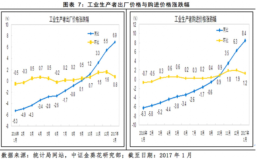 2017年1月份,全国工业生产者出厂价格同比上涨6.9%,环比上涨0.8%。工业生产者购进价格同比上涨8.4%,环比上涨1.2%。
