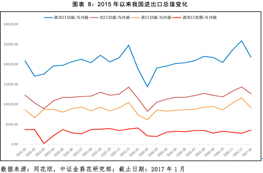 分析:1月份,对外贸易延续2016年以来逐季向好走势,进出口双双实现两位数增长,实现了开门红。从3月1日公布的制造业PMI指数来看,新出口订单指数和进口指数均高于上月0.5个百分点,连续4个月位于扩张区间,这说明我国对外贸易继续转好,且竞争优势明显。