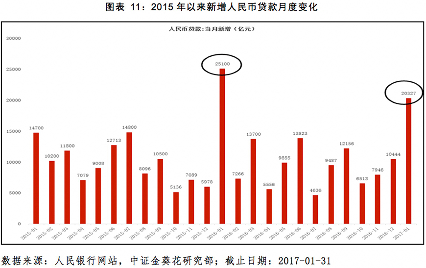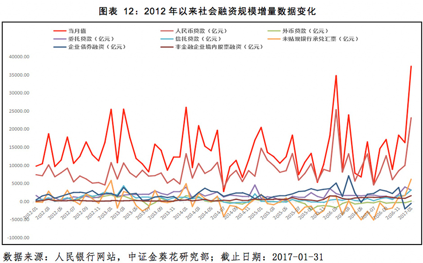 分析:1月新增人民币贷款低于市场预期的2.5万亿元,银行主动大幅压缩短期票据融资是重要原因。1月企业中长期贷款规模和占比创新高,已取代居民房贷,成为信贷高增的主要贡献力量。1月社会融资规模增量达创纪录的3.74万亿元,其中表外融资贡献1.7万亿元,比如信托贷款、委托贷款、票据融资等均大幅增加。