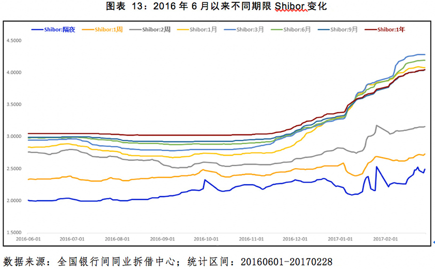 2月份,从上海银行间同业拆放利率变化来看,各不同期限Shibor品种整体出现大幅上涨。其中,1月、3月、6月、9月与1年期限Shibor品种涨幅较大,且3月与6月期限的Shibor品种出现倒挂。