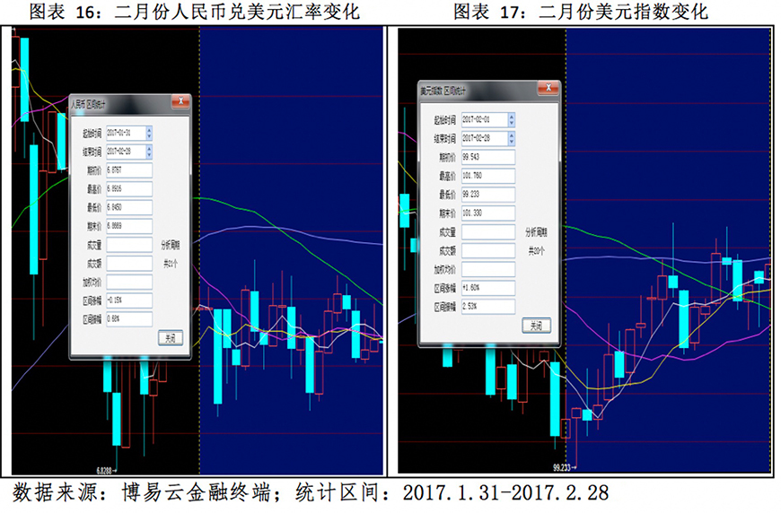 在资本项目管制加强影响下,2月份外汇市场慢慢趋于稳定,人民币兑美元即期汇率小幅上涨。同时,人民币兑美元汇率单日区间明显扩大。2月份,美元指数小幅上涨,但是区间振幅加大。