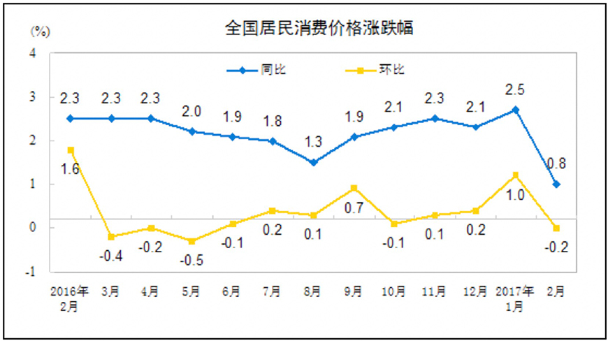 2017年2月份,全国居民消费价格总水平同比上涨0.8%。其中,城市上涨0.9%,农村上涨0.6%;食品价格下降4.3%,非食品价格上涨2.2%;消费品价格下降0.1%,服务价格上涨2.4%。1-2月平均,全国居民消费价格总水平比去年同期上涨1.7%。