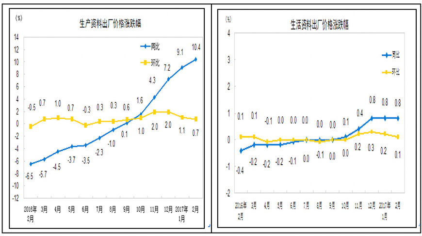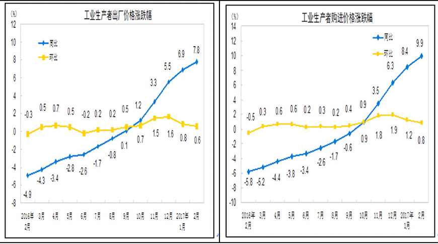 2017年2月份,全国工业生产者出厂价格同比上涨7.8%,环比上涨0.6%。工业生产者购进价格同比上涨9.9%,环比上涨0.8%。1-2月平均,工业生产者出厂价格同比上涨7.3%,工业生产者购进价格同比上涨9.1%。