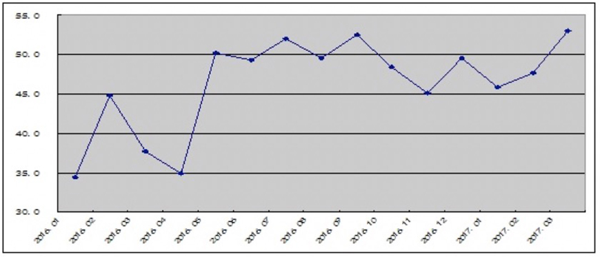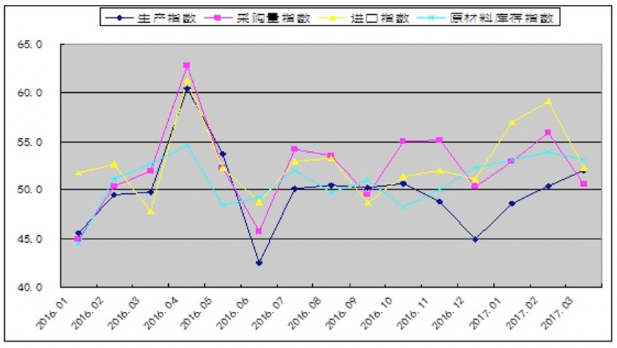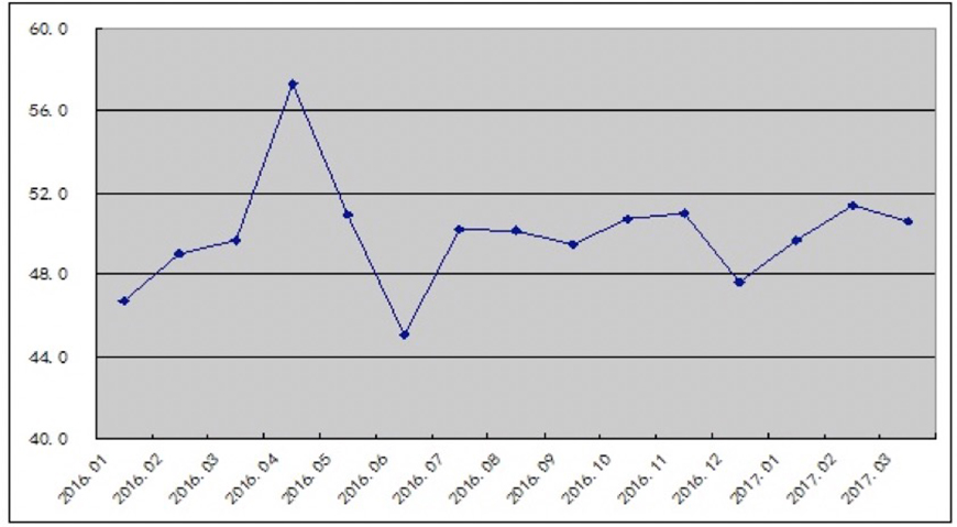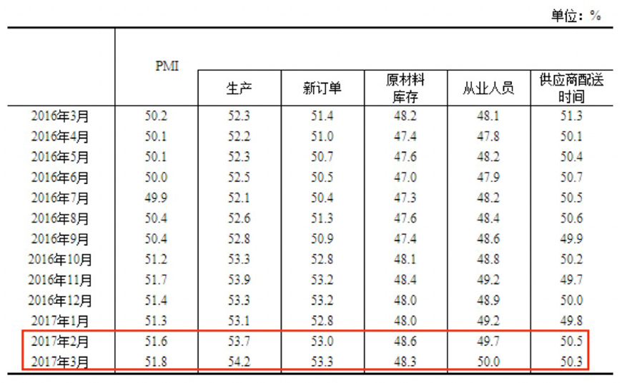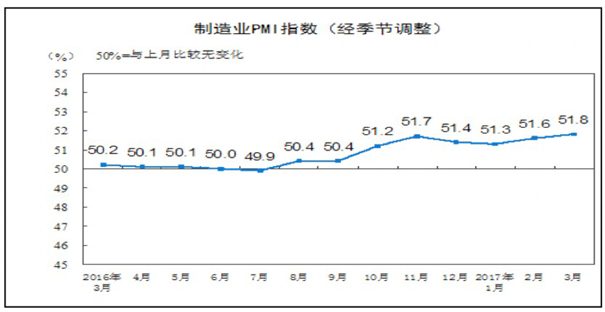 2017年3月份,中国制造业采购经理指数(PMI)为51.8%,连续两个月上升,高于上月0.2个百分点,制造业持续保持稳中向好的态势。