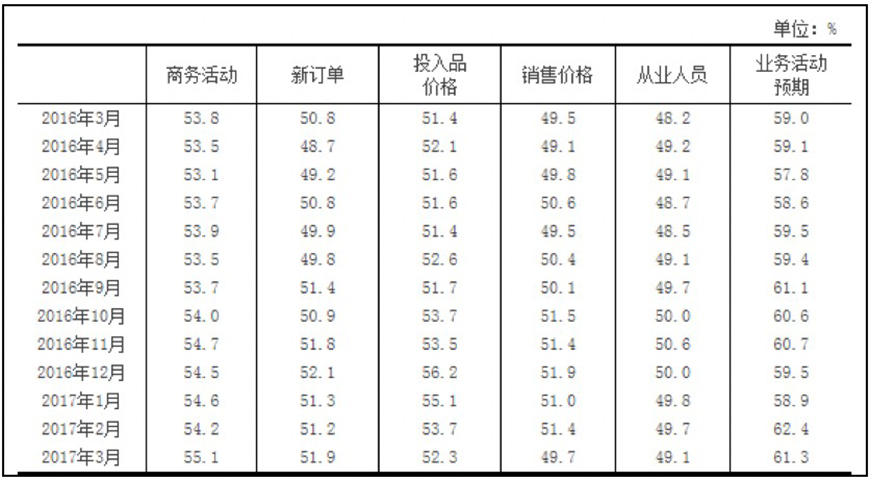 在制造业经济回稳的带动下,生产性服务业和物流业的增速连续两个月加快,本月商务活动指数升至61.0%和57.7%,均为今年以来的高点。建筑业扩张速度有所加快。从市场预期看,建筑业业务活动预期指数为66.7%,连续三个月上升,为2015年7月以来的高点,企业对未来市场信心继续增强。