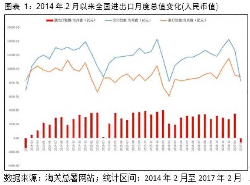 自2014年2月中国当月出现贸易逆差1397.85亿元以来,中国对外贸易一直保持顺差态势。时隔整整三年,当月对外贸易再现逆差,这从情绪上对市场产生了一定扰动。