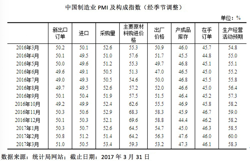3月31日,统计局公布数据显示,2017年3月份,中国制造业采购经理指数(PMI)为51.8%,连续两个月上升,高于上月0.2个百分点,制造业持续保持稳中向好的态势。