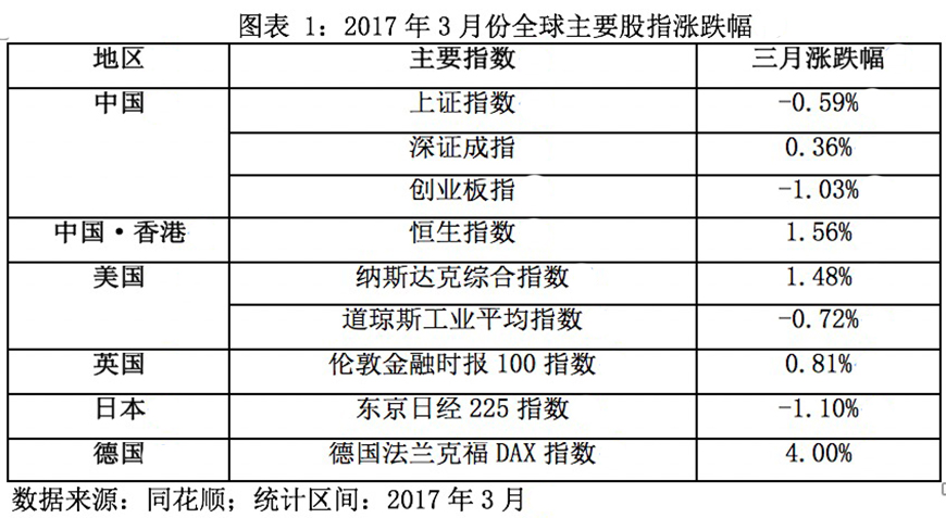 3月份,A股市场涨跌互现。截止3月31日,上证指数涨幅-0.59%,报收3222.51点;深证指数涨幅0.36%,报收10428.72点;创业板指数涨幅-1.03%,报收1907.34点。板块方面,国企改革、一带一路、次新股、高送转、食品饮料等板块强势,推动指数上涨。