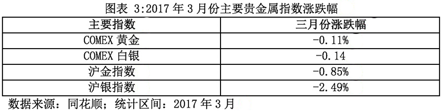 3月份,美黄金涨幅-0.11%,美白银涨幅-0.14%;沪金涨幅-0.85%、沪银涨幅-2.49%。