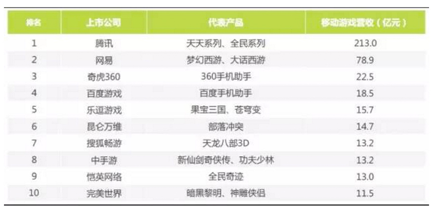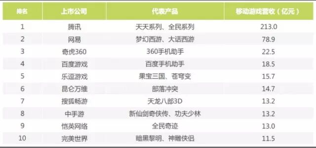 2015年中国移动游戏市场上市企业营收Top10