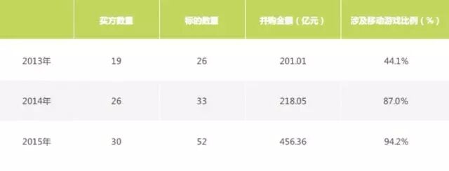 2015年中国游戏并购规模超过450亿,是2014年并购规模的近2倍有余,其中移动游戏相关比例高达94%。以盛大游戏、中国手游为代表的美股退市游戏公司,深受国内资本市场的喜爱,收购价格频频打破国内游戏公司收购价格纪录。