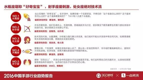 通过分析12星座用户对手游资讯的关注度看到,“好奇宝宝”水瓶座最爱玩儿手游。在手游中,如果你被一个玩家抓住,不停问你“这个装备怎么来的?这个副本你怎么过的?这个道具哪里来的?”TA十有八九是个水瓶座。