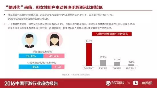 通过联合一点资讯的数据发现,关注手游相关信息的用户主要聚集在24岁以下,占了整体用户的67.1%,90后和00后为手游信息的主要订阅人群。